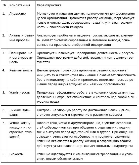 Корпоративная модель компетенций позволяет унифицировать требования к сотрудникам и создать единые стандарты поведения, которые используются при их подборе, оценке, обучении и продвижении (табл. 8). Так, во время подбора персонала модель профессиональных компетенций является критерием отбора необходимых сотрудников, что значительно экономит время и средства. В ходе отбора компетенции кандидата сравниваются с «портретом идеального сотрудника» – корпоративной картой компетенций на данное рабочее место. Также можно легко установить, кто из штатных сотрудников ближе всего по знаниям и навыкам к желаемому профилю.
