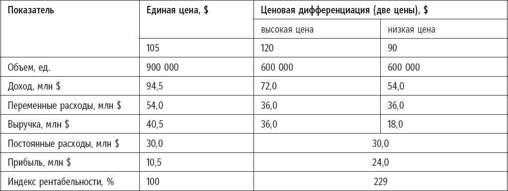 Можно значительно повысить прибыль, предложив две цены ($120 и $90) вместо единой цены $105. Если найти способ «сортировать» потенциальных покупателей по их готовности платить максимальную цену, то все, чья максимальная цена составляет $120 и выше, заплатят $120. Цена $90 привлечет всех потенциальных покупателей, чья максимальная цена находится в промежутке между $90 и $120. С помощью двух цен прибыль в этом примере подскочит до $24 млн в отличие от $10,5 млн при единой цене, то есть разница огромная – 129 %.