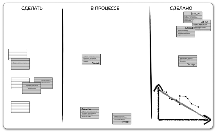 Рис. 2.3. Agile-команды часто используют доски задач, чтобы размещать на них задачи и отслеживать прогресс. Они будут писать задачи или пользовательские истории на карточках и перемещать их по доске, отмечая прогресс. Многие команды также рисуют диаграммы на своих досках, чтобы демонстрировать прогресс