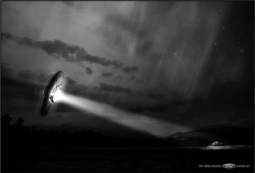 Ну и самые фантастические варианты – самолет делает несколько витков над автомобилем (рис. 140), чтобы получше его рассмотреть, а летающая тарелка демонстрирует свой пиетет, помогая освещать ночную дорогу (рис. 141).