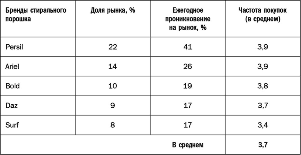 В табл. 2.2 проанализированы доли рынка ведущих брендов в категории порошков для стиральных машин. Как можно заметить, все эти продукты приобретаются не более четырех раз в год. Самый крупный бренд, Persil, покупают по максимуму – каждые три месяца. А количество покупателей Surf, самого мелкого из представленных, недотягивает и до половины числа приверженцев Persil; более того, покупают Surf примерно 3,5 раза в год. Такая закономерность носит название закона двойной ответственности, потому что небольшие бренды теряют вдвое: продажи ниже, поскольку у них меньшее число потребителей, да еще и частота покупок уменьшается.