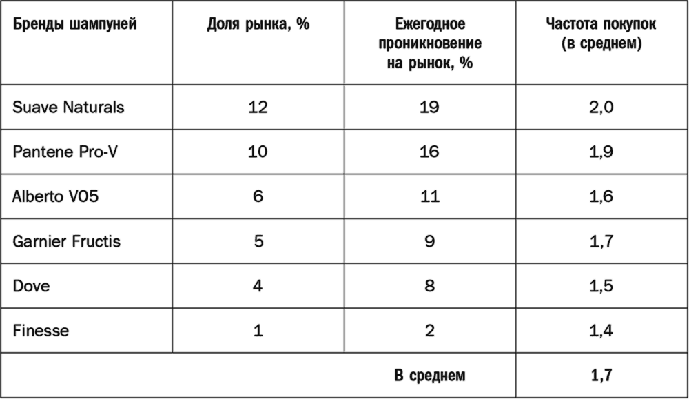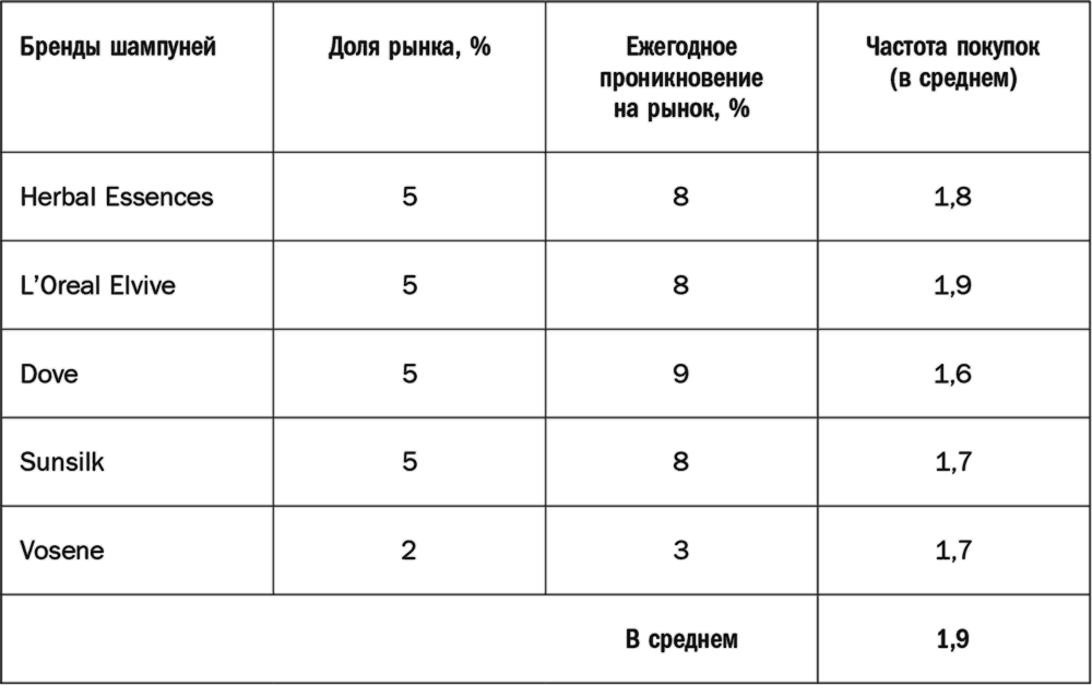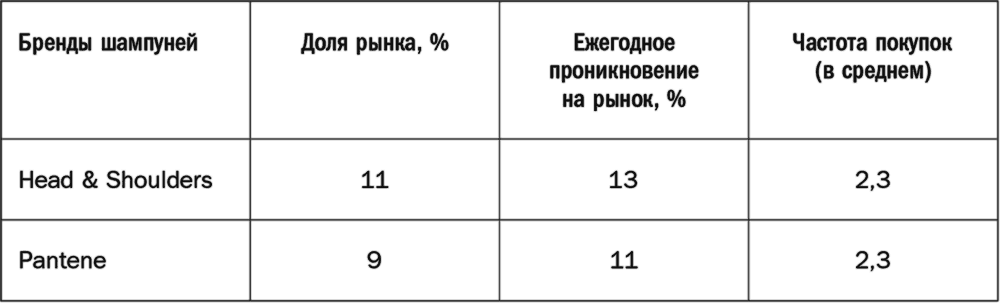 Представленные Nielsen данные показывают, что в категории американских шампуней наблюдается такая же закономерность. В этих двух случаях мы имеем разные бренды, разные доли рынка, разных потребителей, разные временные периоды, разные потребительские панели и разные группы исследователей, но при этом – те же известные закономерности двойной ответственности. Ниже мы еще обсудим, почему так происходит и какие выводы в плане лояльности из этого следуют, а пока будем по-прежнему сосредоточиваться на последствиях этого научного закона для роста брендов (табл. 2.4).