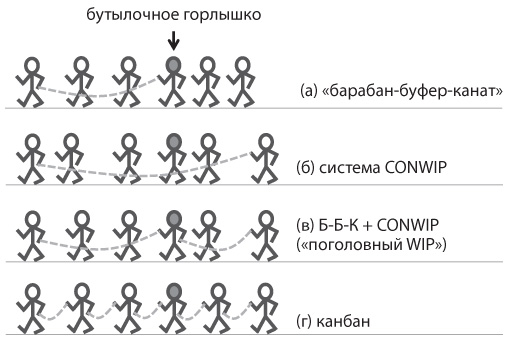 Рис. 10.2. Человечки, иллюстрирующие четыре различных варианта WIP-лимитов в разных вытягивающих системах
