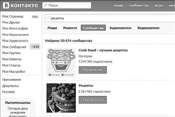 Рис. 1. Поиск сообществ по слову-интересу «рецепты»