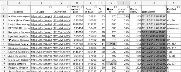 Давайте разберемся со всеми колонками. Первые две вы заполняете сразу, как находите паблики; также сразу заполняете колонку «Количество подписчиков сообщества».
