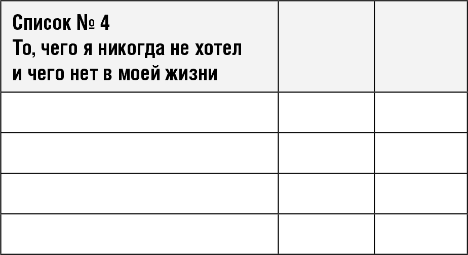 Ценности и приоритеты проявляются не только в том, что вы стремитесь осуществить, но и в том, от чего вы до сих пор с успехом уклонялись. Возможно, даже неосознанно. Тем более стоит подумать над этим серьезно. Итак, в последний список внесите то, чего вы всегда опасались и старались всеми силами избежать. Например, безработица, болезни, долги, судебные разбирательства, разрыв отношений или неудачная женитьба.