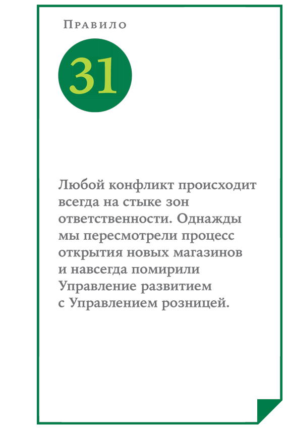 Чтобы решить конфликт двух подразделений и перезапустить процесс открытия новых магазинов, нам пришлось прибегнуть к помощи сторонних модераторов. Мы собрали воюющих друг с другом розницу и развитие под одной крышей. Модераторы вели эту встречу с огнетушителями, чтобы тут же гасить разгорающийся пожар. Ведь нам было нужно найти общее решение, а не переругаться в пух и прах.