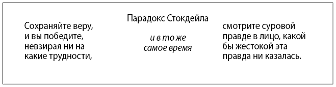 Этот разговор с адмиралом Стокдейлом запомнился мне и на самом деле оказал огромное влияние на мое собственное развитие. Жизнь несправедлива, мы то теряем, то выигрываем. Мы все испытываем разочарования, переживаем трагедии, неудачи, для которых нет объективной причины и в которых некого винить. Это могут быть болезнь, травма, потеря близкого человека, потеря места в результате политических перестановок, это могут быть сбитый над Вьетнамом самолет и восемь лет в лагере для военнопленных. Отличает людей не то, сталкиваются ли они с трудностями, а то, как они справляются с неизбежными испытаниями, уготованными им судьбой. В борьбе с невзгодами парадокс Стокдейла (сохраняйте веру, и в конце концов вы победите, но также смотрите в глаза самой суровой правде жизни) является действенным принципом, который позволит выйти из борьбы более сильным. Я думаю, здесь урок не только для меня, но и для всех, кто примет и будет использовать этот принцип.