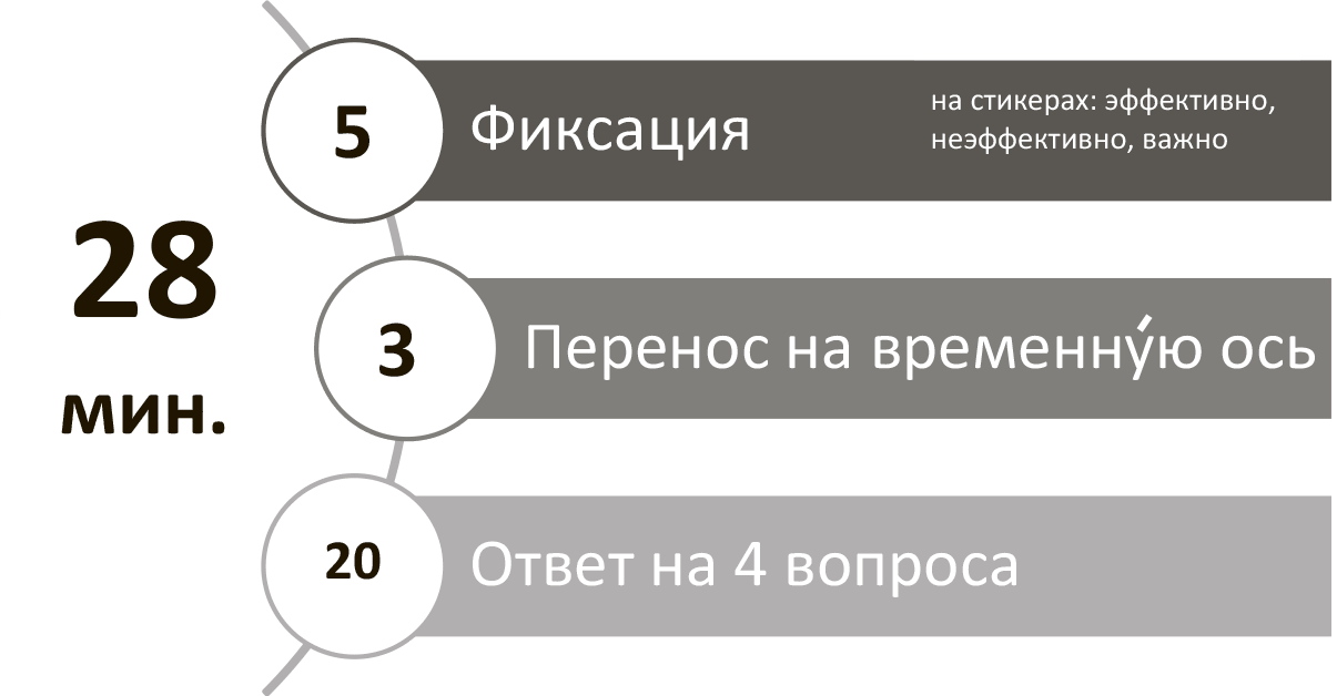 В течение трех минут участники наклеивают стикеры на временну?ю ось, оценивая эффективность обсуждения каждой из тем.