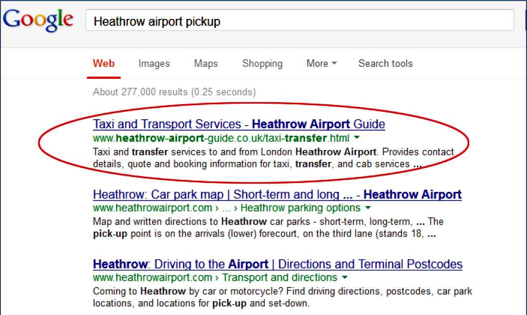 Пример того, как домен с дефисами ранжируется лучше тех, у кого нет дефисов, включая официальный сайт аэропорта Heathrow