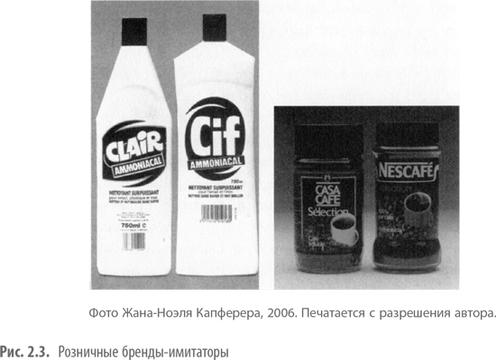 На смену немаркированным товарам, особенно в США, пришли товары, на которых в качестве названия марки стоит название магазина. Мы будем называть их марками розничных магазинов. Эти марки розничных магазинов являются подделками в том смысле, что часто товары под этими марками имитируют товар брендов ведущих производителей. К примеру, упаковка и этикетка средства для полоскания рта под маркой Equate магазина Wal-Mart похожа на конкурирующий товар марки Plax. Аналогично средство для полоскания рта сети Target похоже на товар ведущего производителя Wintergreen Listerine. Аптечные сети CVS и Walgreens также предлагают весьма схожие средства для ухода за полостью рта под своими марками.