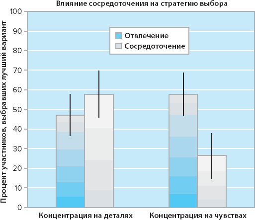 Миклс захотел узнать, влияет ли на ситуацию предоставление дополнительного времени на размышление. Он снова поставил эксперимент со сложной задачей, но на этот раз половина участников попала в группу «сознательно обдумывающих», а половина – в группу «отвлекающихся». Представители первой группы должны были три минуты сосредоточенно обдумывать свой выбор. Вторая же группа в течение этих трех минут выполняла задания, требующие концентрации внимания. Например, нужно было смотреть на цифры, отображаемые в течение двух секунд, и подавать сигнал в случае совпадения текущего числа и демонстрировавшегося за два числа до этого. Через три минуты представители обеих групп должны были выбрать лучший, по их мнению, автомобиль из четырех представленных. Результат этого эксперимента показан на рис. 16.3.