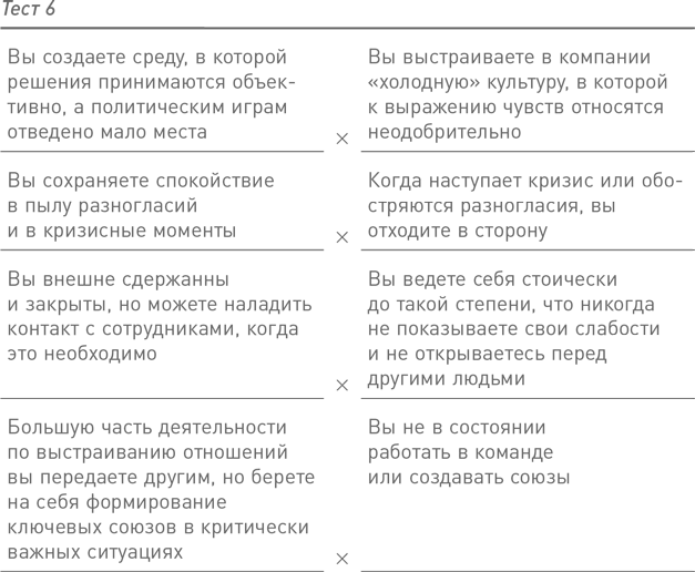 Отстраненность становится деструктором тогда, когда изолирует вас от ключевых людей — как внутри, так и снаружи компании. Многих руководителей, обладающих высокой продуктивностью, окружающие описывают словами «застенчивый», «рациональный», «скрытный», «стремящийся к уединению» и рядом других, наводящих на мысль об отстраненности; однако эти руководители сумели достичь высокого положения, поскольку научились справляться со своим деструктором. Хотя они не стали первоклассными специалистами по выстраиванию отношений, они знали о своих склонностях и предприняли шаги к тому, чтобы обуздать эти склонности и не позволить им стать источником проблем для компаний и для самих руководителей. Описанные в тесте 6 признаки позволят вам понять, не заставила ли вас ваша отстраненность перешагнуть черту в сторону фиаско.