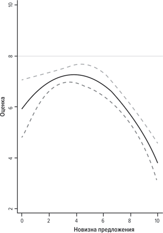 Самые новаторские проекты получили худшие оценки [71]. «Никто не любит новое, – объяснял мне один из авторов исследования Карим Лакхами. – Эксперты чересчур критически относятся к проектам в своих областях знаний», – добавил он. Слишком типичные предложения воспринимались чуть лучше, но также получали низкие оценки. Выше всего оценивались проекты, которые считались умеренно новыми. Существует понятие «оптимальная новизна» идей, пояснял Лакхами. Они должны быть необычными, но приемлемыми. График оптимальной новизны выглядит следующим образом: