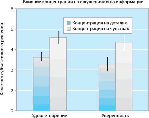 Посмотрите на рис. 16.2. Представители группы, фокусировавшейся на чувствах, не только приняли в основной массе лучшие решения, но и оказались более удовлетворенными сделанным выбором, а также продемонстрировали большую уверенность в правильности своего выбора.