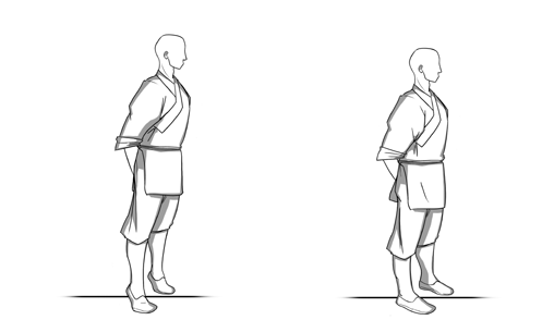 • Затем расслабьте тело, выдохните и вернитесь в устойчивое положение, как будто вы падаете на пятки. При этом руки остаются за спиной в легкой сцепке.