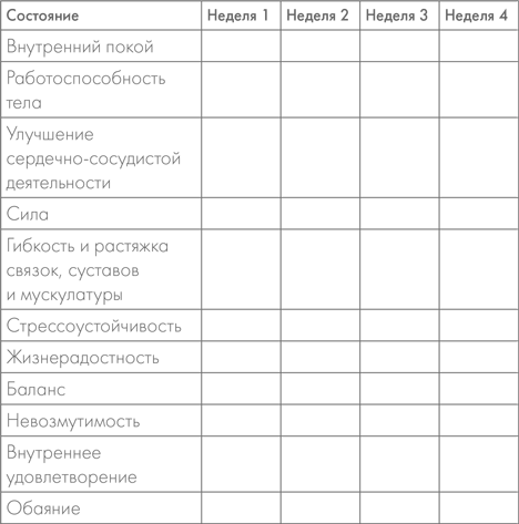 Мы рекомендуем вам ежедневно практиковать «Восемь благородных упражнений», лучше всего по утрам. Если повторять каждое упражнение восемь раз, то на это вам потребуется около десяти минут. Это совсем немного, если помнить о том положительном эффекте, который упражнения оказывают на тело, разум и дух. С помощью приведенной далее таблицы вы сможете еженедельно документировать изменения в процессе обретения баланса.