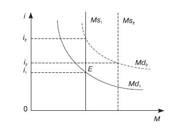Рис. 6.1. Зависимость номинальной процентной ставки от количества денег в обращении М: Md – совокупный спрос на деньги; Ms – предложение денег; Е – точка равновесия денежного рынка; i – равновесная процентная ставка