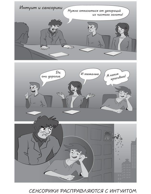 Когда встречаются сенсорик и интуит, может возникнуть дискоммуникация, потому что их восприятие мира кардинально различается. Однажды на защите проекта я как ярко выраженный интуит напоролся на непробиваемого сенсорика. Очень эмоционально, одухотворенно и красочно я рассказал клиенту об идее проекта. О том, что участникам мероприятия предстоит увлекательное путешествие на Северный полюс, где они дружно, единой командой построят маяк, который будет освещать путь к успеху их компании. Я попросил клиента представить себе Арктику, скованную вечными льдами, и то, как гостей встречают на мероприятии белые медведи и пингвины. К сожалению, пингвины стали последней каплей, и он прервал мой вдохновенный спич резким, но вполне резонным возражением: «На Северном полюсе нет пингвинов». Оказалось, что данному клиенту совершенно неинтересны сказки о белых медведях и воображаемый Северный полюс. Его волнуют вполне конкретные вопросы: количество еды в кейтеринг-зоне[10] в граммах на человека, площадь застройки и местоположение туалетов на площадке.