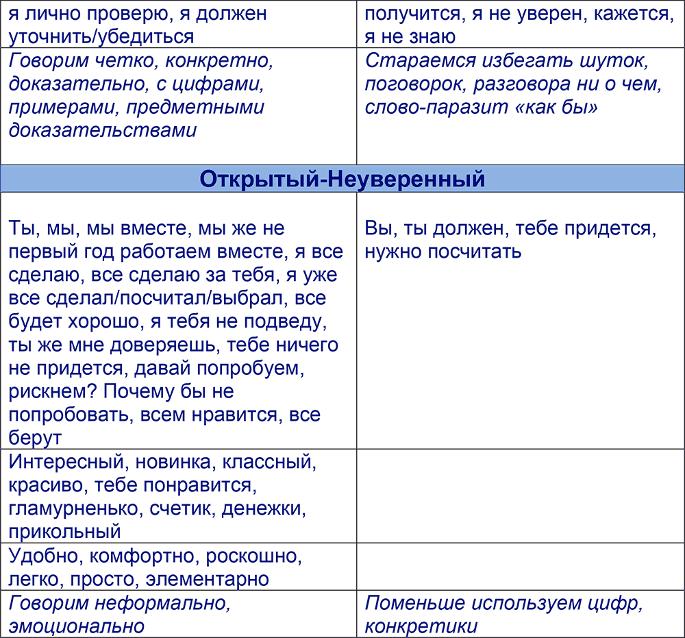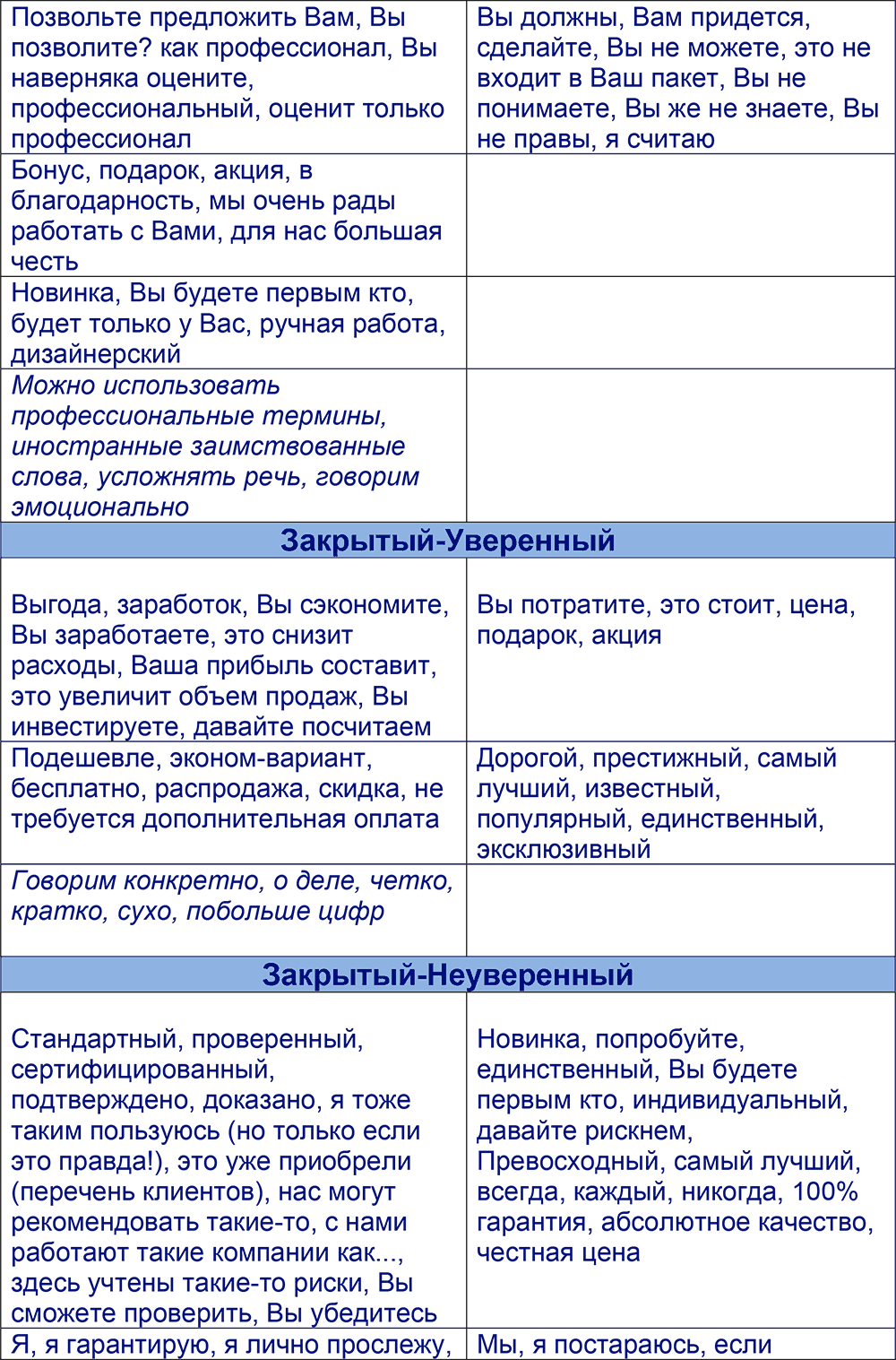 Разные типы клиентов общаются по-разному. Есть слова, которые им свойственно исользовать, и слова, которые Вы от них вряд ли услышите. Общаясь с ними, лучше использовать «их» слова, и стараться не использовать «чужие». В этом случае Вам легче будет добиться понимания и позитивной реакции.
