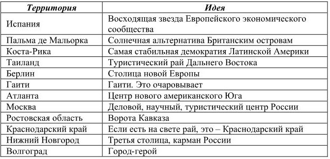 Смешанный имидж. Очень часто в имидже территории могут соседствовать как плюсы, так и минусы, не взаимосвязанные друг с другом. Например, Италия (как и многие другие страны) для посетителей выглядит весьма привлекательно, но до тех пор, пока турист не столкнется с забастовкой авиационных, железнодорожных или гостиничных служащих61.