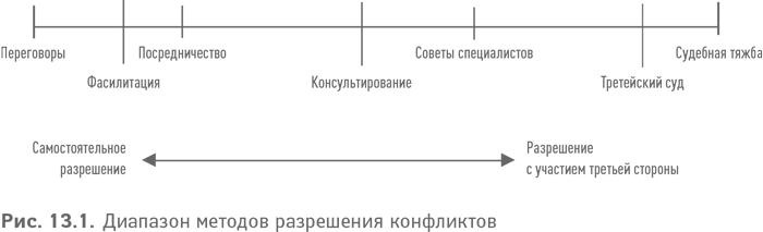 Методы разрешения конфликтов варьируются от переговоров до судебных процессов[68]. Методы, расположенные на диаграмме слева (рис. 13.1), отличаются высочайшей степенью самостоятельности всех вовлеченных лиц. Сторонние участники оказывают большее влияние, если партнеры прибегают к методам, расположенным на диаграмме справа; крайнее их проявление – полная зависимость конечного результата от судьи или арбитра.