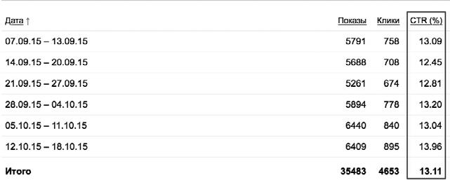 Пример приемлемого разброса CTR – не более 7 % от среднего