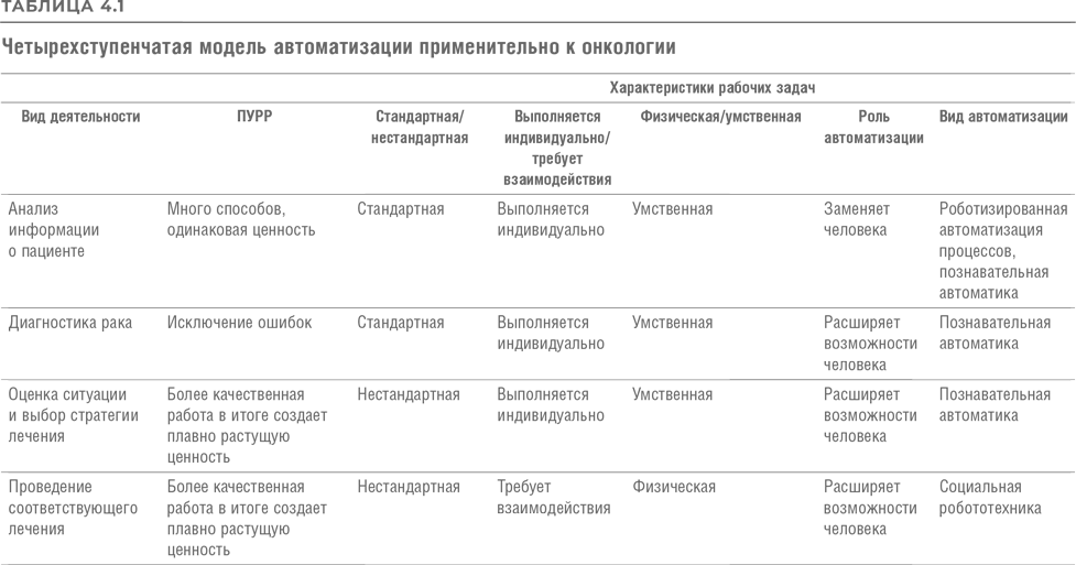 Вернемся к примеру из области медицины. Табл. 4.1 демонстрирует, каким образом можно совместить все элементы нашей модели, если говорить об автоматизации работы онкологов.
