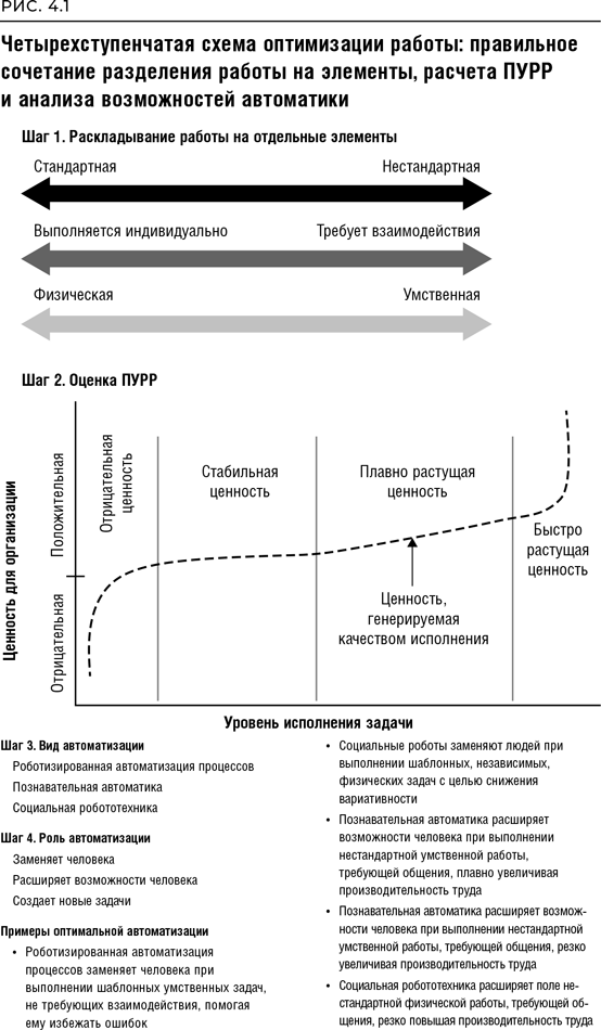 В результате первые три шага – выделение значимых элементов работы, расчет ПУРР по каждому из них и анализ возможностей автоматизации – объединяются на четвертой ступени схемы, где нам предстоит подобрать оптимальную комбинацию человеческого труда и автоматов.