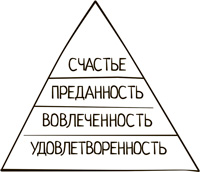 Материальная мотивация – это база, без нее никуда. Мы все понимаем, что вряд ли кто-то согласится постоянно работать без зарплаты только из большой любви к компании. Это основа, фундамент, на котором в дальнейшем строится лояльность и преданность сотрудников по отношению к своему работодателю. Прежде чем поговорить об эффективной нематериальной мотивации, надо разобраться с тем, что же такое эта пресловутая «лояльность». Определений очень много, исследований и философско-научных трудов – тоже. Я предлагаю максимально простую и ясную схему. Ту, которой придерживаюсь сам. Предлагаю выделить три уровня лояльности по традиционно сложившейся практике: удовлетворенность, вовлеченность и преданность. Давайте попробуем разобраться с этими ступенями.