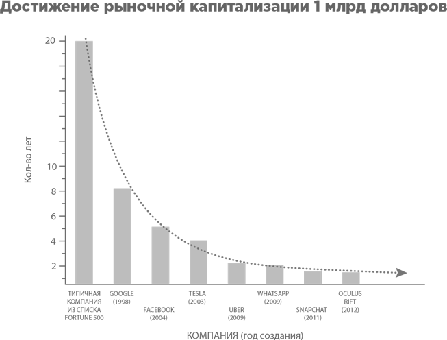 Просчеты в стиле Iridium и эпохальная смена лидеров в фотоиндустрии с Kodak на Instagram не были изолированными событиями. Сегодня ведущие американские компании из списка Fortune 500 сталкиваются с конкуренцией не только и не столько со стороны крупнейших китайских и индийских компаний. Как верно заметил Питер Диамандис, их конкурентами все чаще становятся стартапы, которые создаются умными парнями в своих гаражах и грамотно используют технологии экспоненциального роста. Сервис YouTube вырос из стартапа, который был создан на личные средства Чада Херли, и менее чем за полтора года завоевал такую бешеную популярность, что был приобретен Google за 1,4 млрд долларов. У Groupon период от задумки до компании стоимостью 6 млрд долларов занял менее двух лет. Самый дорогой стартап в мире Uber сегодня оценивается почти в 17 млрд долларов, что в десять раз превышает его стоимость всего два года назад. Мы видим новый тип организаций, которые растут и генерируют стоимость со скоростью, доселе невиданной в мире бизнеса. Приведенный график наглядно показывает ускоряющийся метаболизм экономики.