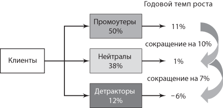 Полученные результаты представлены на рис. 2.5. Как мы и ожидали, на клиентов из числа промоутеров приходится самый большой объем продаж. Обеспечивая компании увеличение доходов в размере 11 процентов в год, эти заказчики становятся движущим фактором роста компании. На сегмент нейтралов приходится 38 процентов общего количества клиентов, однако их весьма скромный вклад в рост компании не идет ни в какое сравнение с положительным экономическим влиянием промоутеров. На детракторов приходится совсем небольшое количество клиентов (12 процентов), но они оказывают негативное влияние на рост доходов, составляющий в данном случае отрицательную величину ?6 процентов. В общей сложности процент клиентов в каждом сегменте лояльности, взвешенный по среднему темпу роста, приблизительно соответствует общему темпу роста компании за тот же период (около 5,3 процента). Таким образом, данная модель однозначно подтверждает вывод, что клиенты с высоким NPS обеспечивают более высокий рост доходов, тогда как влияние детракторов носит прямо противоположный характер.