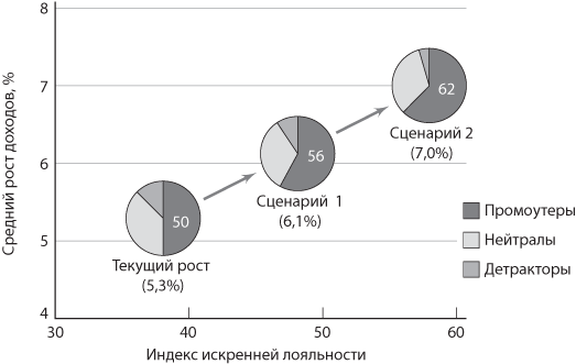 На рис. 2.6 отображены два сценария повышения лояльности и ожидаемого влияния на рост компании с течением времени. Темп роста 5,3 процента рассчитан с учетом существующего разделения клиентов на промоутеров, нейтралов и детракторов, а также данных о темпах роста в каждом из этих сегментов. Используя темпы роста по каждому сегменту в качестве постоянной величины, мы можем составить возможные сценарии увеличения объема доходов благодаря продвижению некоторых клиентов по цепочке лояльности. В соответствии с первым сценарием мы перемещаем 6 процентов клиентов в сегмент промоутеров, в том числе 4 процента из сегмента детракторов и 2 процента из сегмента нейтралов. Это обеспечивает повышение ожидаемого темпа роста компании до 6,1 процента. Мы также разработали второй, более агрессивный сценарий, согласно которому перемещение еще 6 процентов клиентов в сегмент промоутеров обеспечивает повышение темпов роста доходов компании до 7 процентов.
