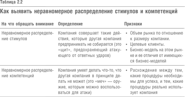 Как определить, насколько асимметрично распределены компетенции конкурентов? Составьте список задач, к которым компании приходится постоянно возвращаться, и для которых уже выработались определенные процедуры, как формальные, так и неформальные. Сравните задачи в списке с теми, что требуются для успеха на «подрывных» рынках. Если процедуры компании способствуют выполнению тех задач, которые возникают в определенных рыночных условиях, то это означает, что у компании есть компетенции, необходимые для завоевания этого рынка. У всех компаний есть сильные и слабые стороны. Когда одна компания обладает преимуществами на тех рынках, где возможности другой компании ограничены, это свидетельствует о несимметричном распределении компетенций.