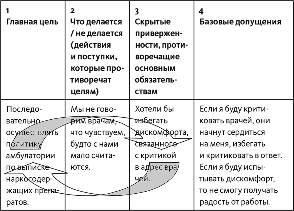 Когда им задали вопрос о взаимоотношениях их главной цели и политики амбулатории по выписке наркосодержащих препаратов, оба ответили, что они согласованы. Оба поддерживали политику амбулатории. Однако, как хорошо видно из их карт, они действовали в неполном соответствии с главными обязательствами (конечно, в основном они эту политику соблюдали, но сами честно признавались, что много раз не следовали ей). Как вы можете увидеть из их карты, такое поведение служило другим важным целям, которые они преследовали, включая избегание негативных результатов (хотя бы видимых) от следования политике амбулатории. Вот типичная картина неприятия перемен: одна нога на газе, другая – на тормозе.