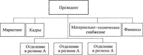 Дивизиональные структуры — это специфические виды структур бюрократического типа, в которых варьируются принципы межфирменного и межфункционального взаимодействия на основе линейно-функциональных связей. Но в силу специфического построения подразделений — либо с ориентацией на регион, либо на продукт, либо на потребителя — эти структуры весьма динамичны и близки к адаптивному типу. С увеличением размеров фирм, внедрением новых технологий, повышением изменчивости внешней среды происходит структуризация органов управления путем выделения управленческих звеньев, специализирующихся по видам товаров — продуктовая структура (рис. 10.4.1), группам потребителей — структура, ориентированная на потребителя (рис. 10.4.2), географическим районам — региональная структура (рис. 10.4.3) и смешанная дивизиональная структура (рис. 10.4.4).