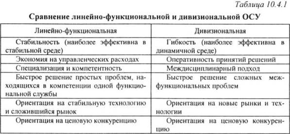 Таблица 10.4.1. Сравнение линейно-функциональной и дивизиональной ОСУ