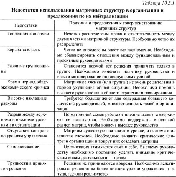 Таблица 10.5.1. Недостатки использования матричных структур в организации и предложения по их нейтрализации