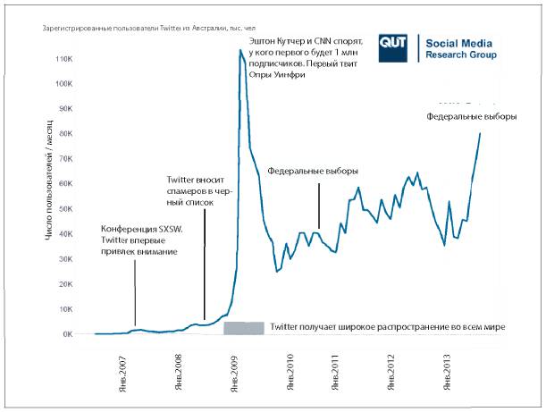 Очевидно, 2009 год для Twitter напоминал аттракцион «американские горки»: беспрецедентный рост числа подписчиков и не менее грандиозное падение (при этом все-таки наблюдалась положительная динамика и рост количества пользователей). За этой одной кривой стоит насыщенная событиями история. Первый подъем (примерно в марте 2007 года) объяснялся шумихой вокруг Twitter на ежегодной конференции South by Southwest Interactive Conference, когда на сервис впервые обратили внимание и количество его пользователей сразу утроилось. Замедление роста после второго подъема (примерно в марте 2008-го) объясняется тем, что тогда Twitter начал активно вносить в черный список спамеров. В 2009 году сервис получил уже широкую известность, в апреле на пике популярности, как раз перед падением, Эштон Кутчер поспорил с телеканалом CNN, у кого из них первым будет один миллион подписчиков (Эштон выиграл буквально через полчаса), а Опра Уинфри первый раз отправила сообщение в Twitter и сделала это в прямом эфире. Аналогичная кривая, построенная на данных пользователей из Австралии, в чем-то похожая на кривую по США, но имеет свои отличия. Так, например, последний рост количества пользователей Twitter в Австралии в 2013 году совпал с проведением выборов на федеральном уровне.