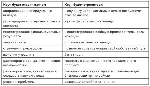Это то, что вы делаете как коуч, и то, что вы говорите о замене, когда двигаетесь от управления к коучингу. Если варианты поведения в правом столбце таблицы случаются чаще и становятся более естественными, то вы прочно стоите на пути становления как agile-коуч. Продолжайте в том же духе.