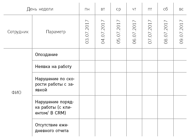 В нем указывается ФИО менеджера по продажам, список нарушений, даты проведения контроля. Чтобы обозначить совершенное нарушение, менеджер ОКК ставит цифру «1» на пересечении даты и вида нарушения. В примечании указывается расшифровка к нарушению: id сделки, в которой нарушение, фактическое время прихода сотрудника на работу или дата, за которую не отправлен ежедневный отчет.