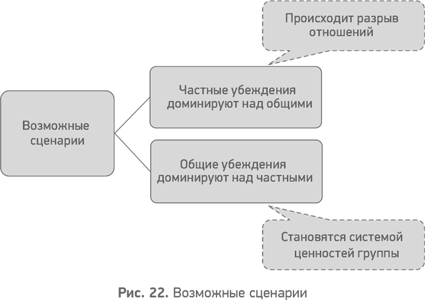 Итак, несколько человек намерены создать организацию. Каждый является носителем собственных убеждений, среди которых есть общие (схожие) для всех членов группы. Отметим, что общие убеждения обычно менее подвержены изменениям в будущем, чем частные. Причем вероятность таких изменений имеет обратную зависимость от числа людей, их разделяющих. Чем больше людей разделяют общие убеждения, тем меньше вероятность их изменений. Важно также отметить, что частные убеждения всегда остаются при каждом из нас. Они продолжают влиять на наше поведение и время от времени вступать в контакт с частными убеждениями других людей.