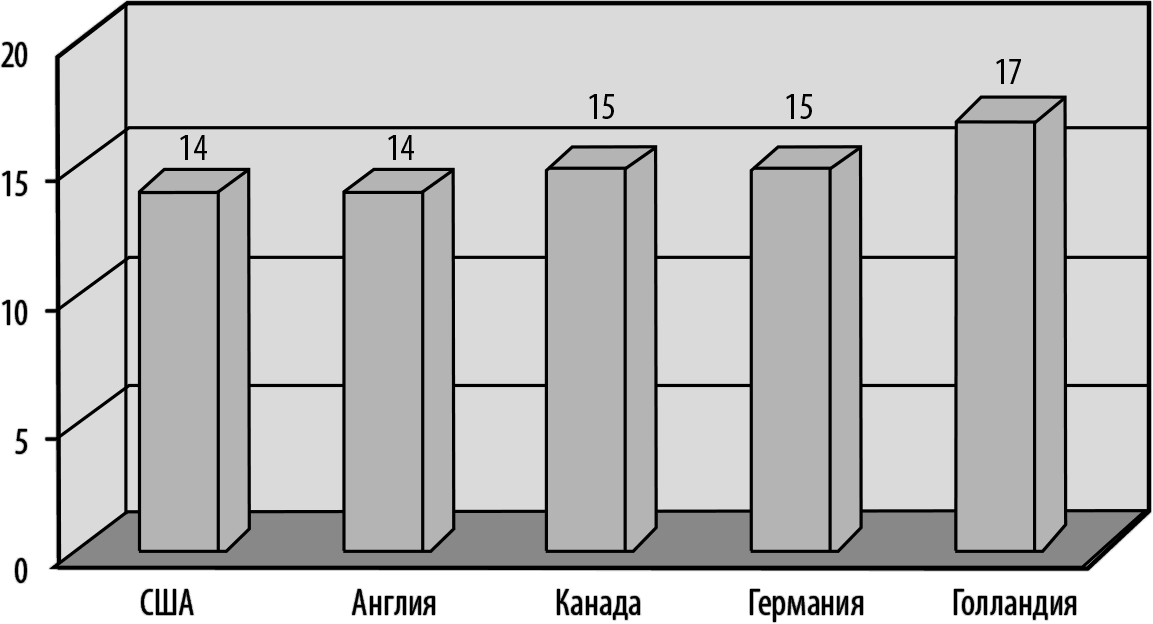 Судя по графику, в США отношение числа операторов к числу супервизоров в среднем составляет 14:1, т. е. на группу из 14 операторов приходится один супервизор. В Голландии же этот коэффициент увеличивается до 17:1. Должна заметить, что такое соотношение полностью соответствует моим представлениям о Голландии. Я не так давно побывала в этой стране и могу сказать, что излишней педантичностью голландцы, на мой взгляд, не отличаются. Идея свободы там превалирует, причем иногда, мне кажется, излишне. Это касается не только легального курения марихуаны, но и коэффициента 17:1.
