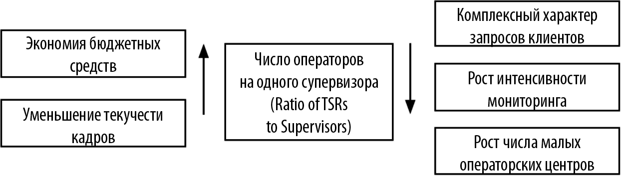 В теории и практике операторских центров существует специальный коэффициент, называемый Ratio of TSRs to Supervisors, или Staff to Supervisor Ratio, показывающий, сколько операторов приходится на одного супервизора. Существует ли оптимальное значение этого коэффициента? Трудно сказать: все зависит от конкретной страны и конкретного рода бизнеса. Ясно лишь одно: чем он ниже, т. е. чем меньше операторов приходится на одного супервизора, тем строже контроль над деятельностью операторов.