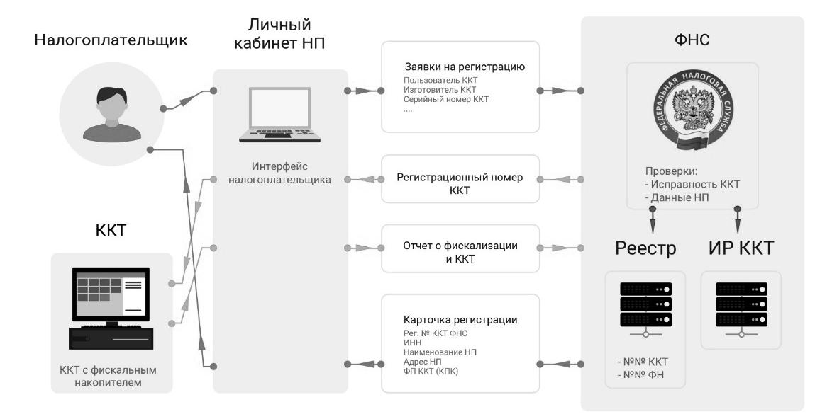 При регистрации ККТ пользователь записывает в фискальный накопитель полученный от налогового органа регистрационный номер ККТ, полный комплекс сведений о ККТ и ФН, необходимый для формирования отчета о регистрации, формирует отчет о регистрации и передает в налоговый орган сведения, содержащиеся в сформированном отчете о регистрации на бумажном носителе.
