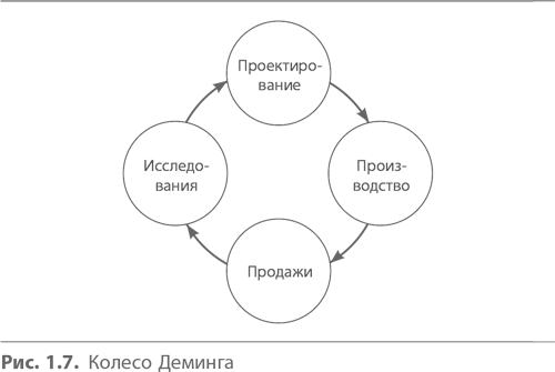 Кроме того, ученый ознакомил японцев с одним из важнейших инструментов контроля качества, так называемым «циклом Деминга»[4], который называют также колесом Деминга или циклом PDCA («планируй – делай – проверяй – воздействуй») (см. рис. 1.7). Он подчеркивал важность взаимосвязи между исследованиями, проектированием, производством и продажами для достижения более высокого качества, удовлетворяющего потребителя. Деминг учил, что это колесо следует поворачивать, исходя, прежде всего, из соображений качества и ответственности за него. При соблюдении этих условий, утверждал он, компания сможет завоевать доверие потребителя, добиться признания своей продукции на рынке и процветания.