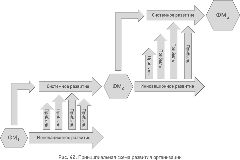 Как показано на рис. 42, для того чтобы компания могла приступить к планомерному системному развитию, например, к трансформации своей функциональной модели из состояния ФМ1 в состояние ФМ2, она должна обладать необходимыми для этого финансовыми возможностями. Они могут появиться, если посредством внедрения инноваций в текущую деятельность компания сможет извлекать необходимую прибыль.