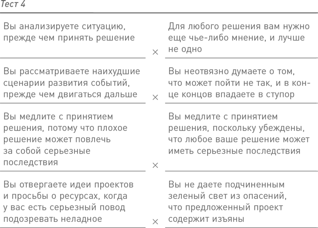 Наш опыт показывает, что лидеры терпят фиаско не тогда, когда они проявляют осмотрительность ситуативно, а тогда, когда осторожность становится для них философией жизни и качеством, выходящим на первый план всегда и везде. Приведенный ниже тест поможет вам определить, с какой стороны черты вы оказались.