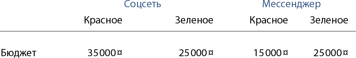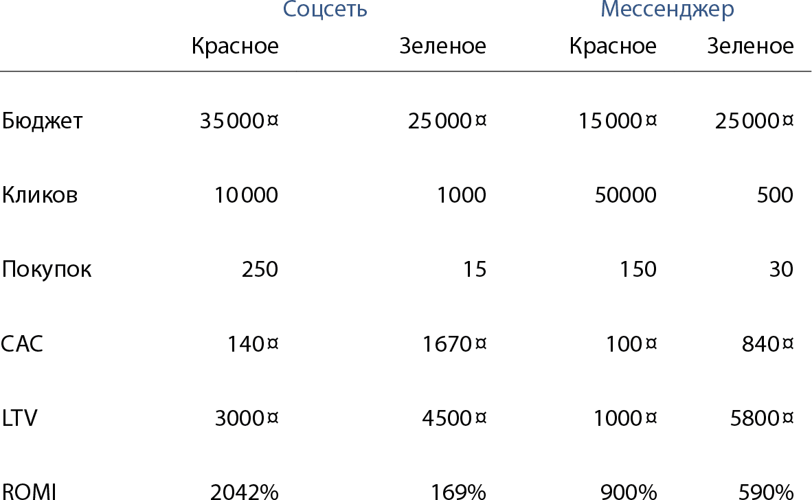 Разберем пример. У нас есть два канала: некая соцсеть и некий мессенджер. Сделаем два объявления: условно назовем их красным и зеленым. В каждое объявление на каждой площадке вложим какую-то свою сумму денег, итого — 100 тысяч рублей: