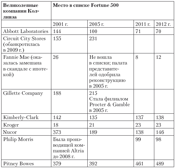 По большей части Коллинз верно назвал победителей. Если мы сравним его список компаний со списком Fortune 500, составленным через 10 лет после выхода книги в свет, то увидим, что большинство упомянутых в книге фирм продолжают устойчиво развиваться и превращаются из хороших компаний в великолепные.